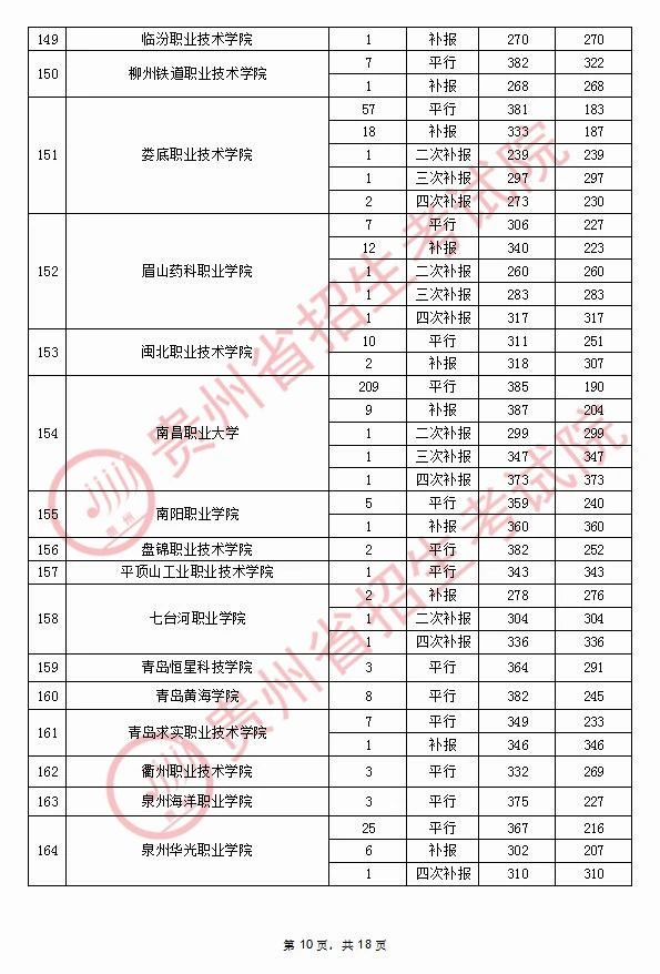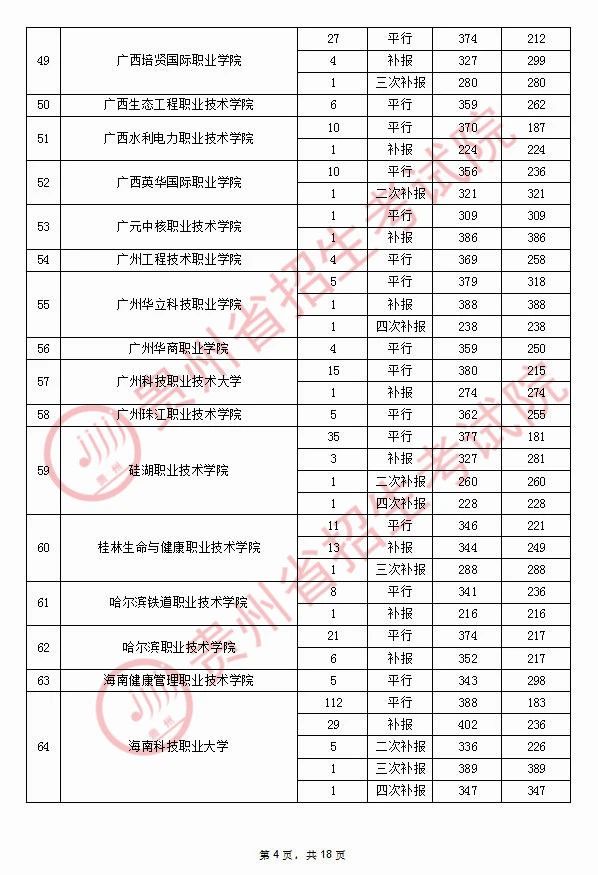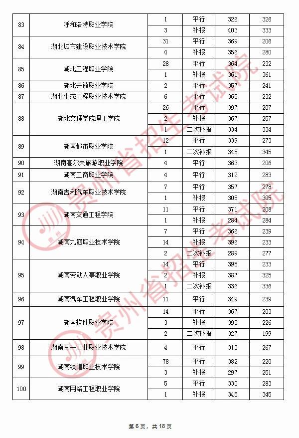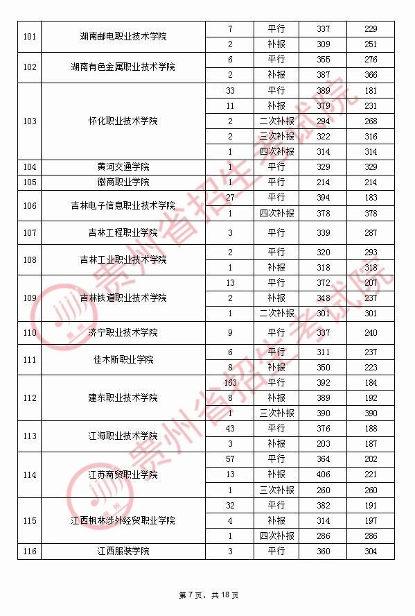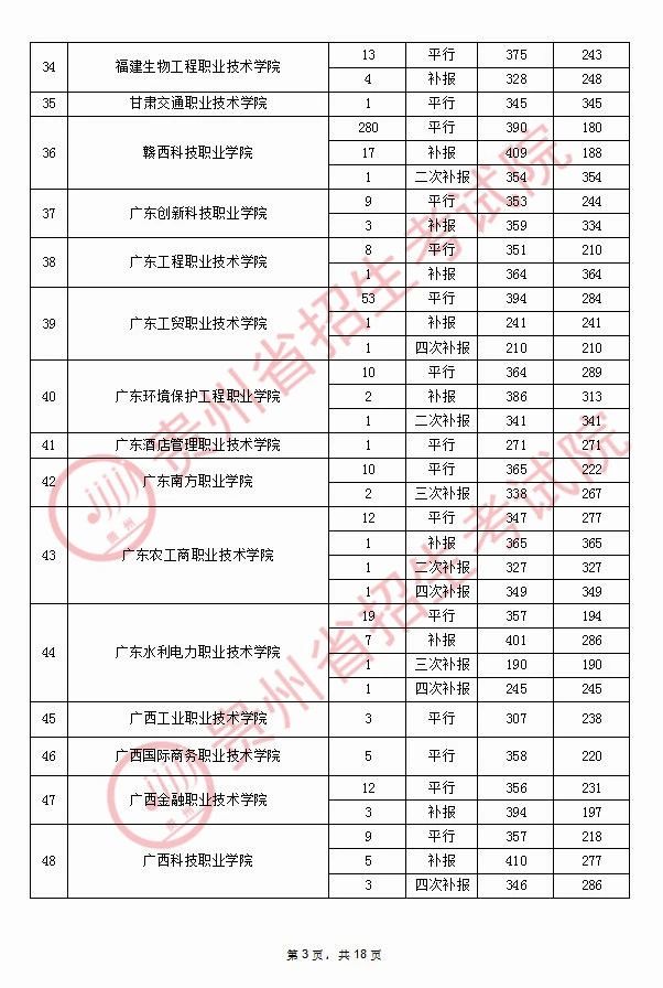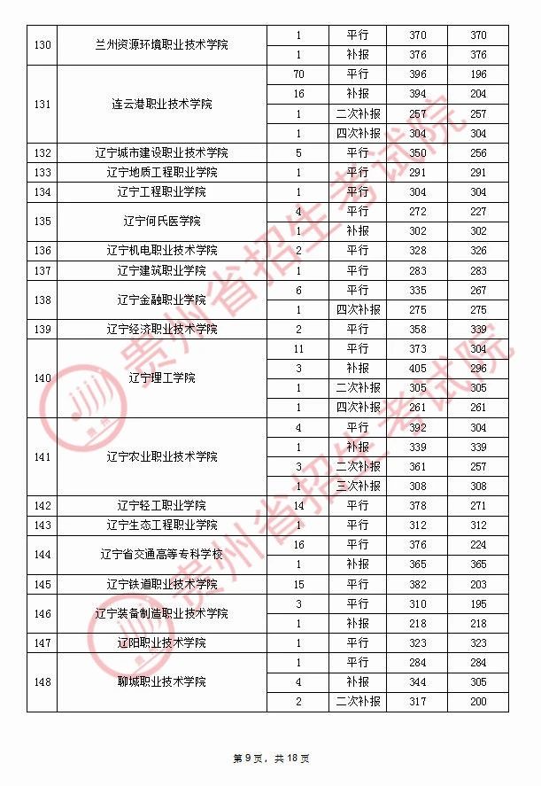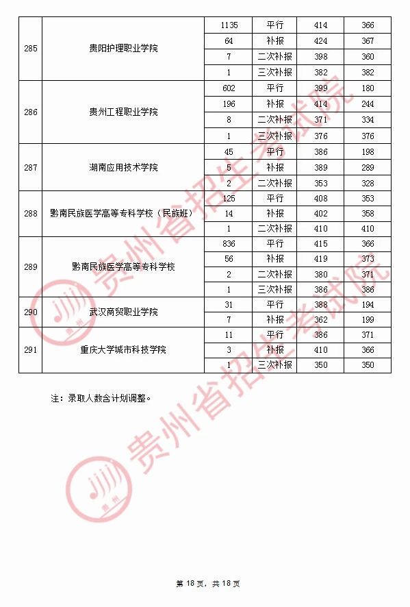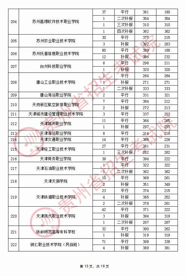 2020年9月17日贵州高考专科院校录取分数线(理科)