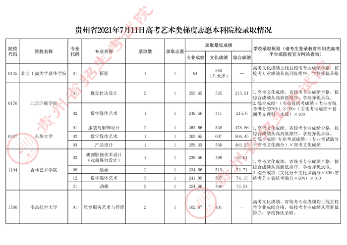 2021年7月11日贵州高考艺术类梯度志愿本科院校录取情况