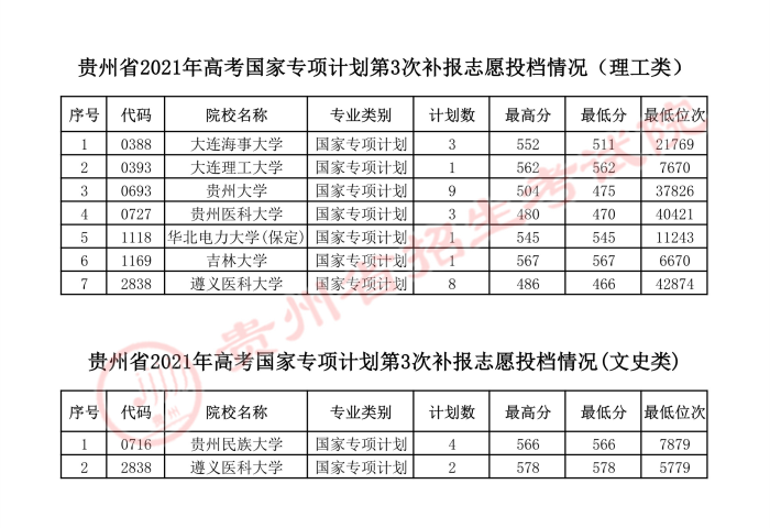 2021年7月19日贵州国家专项计划第3次补报志愿投档分数线