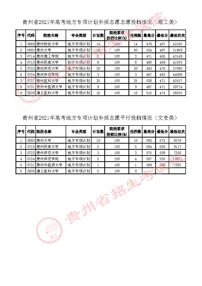 2021年7月19日贵州地方专项计划补报志愿投档分数线