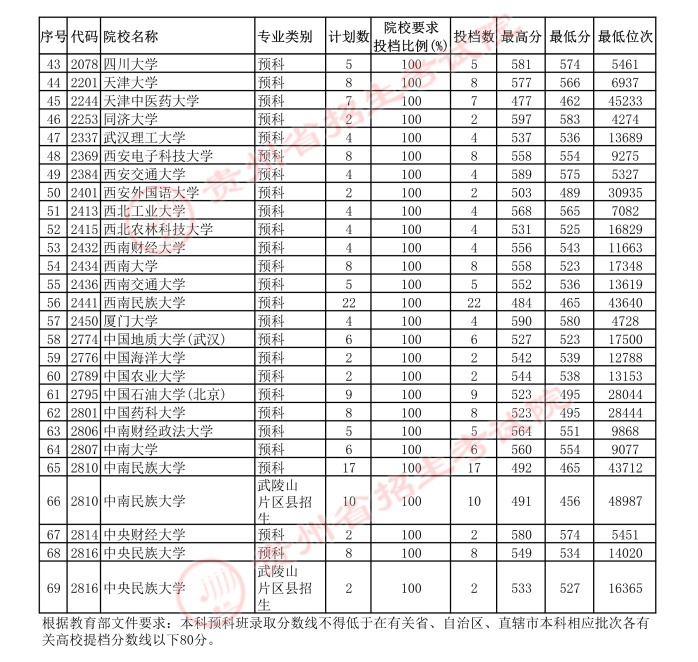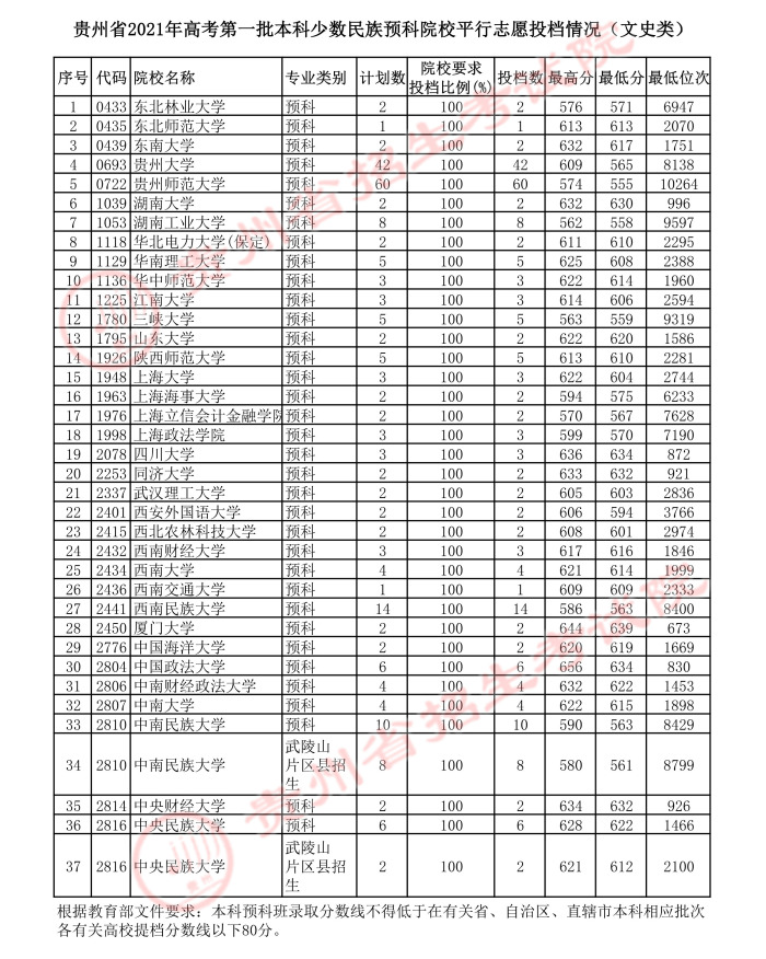 2021年7月26日贵州第一批本科少数民族预科院校投档分数线