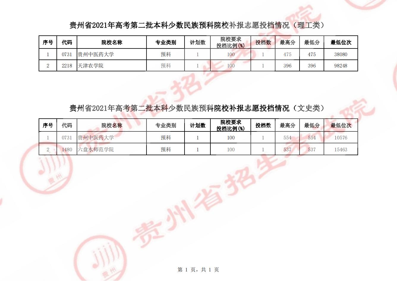 2021年8月3日贵州二本少数民族预科院校补报志愿投档分数线