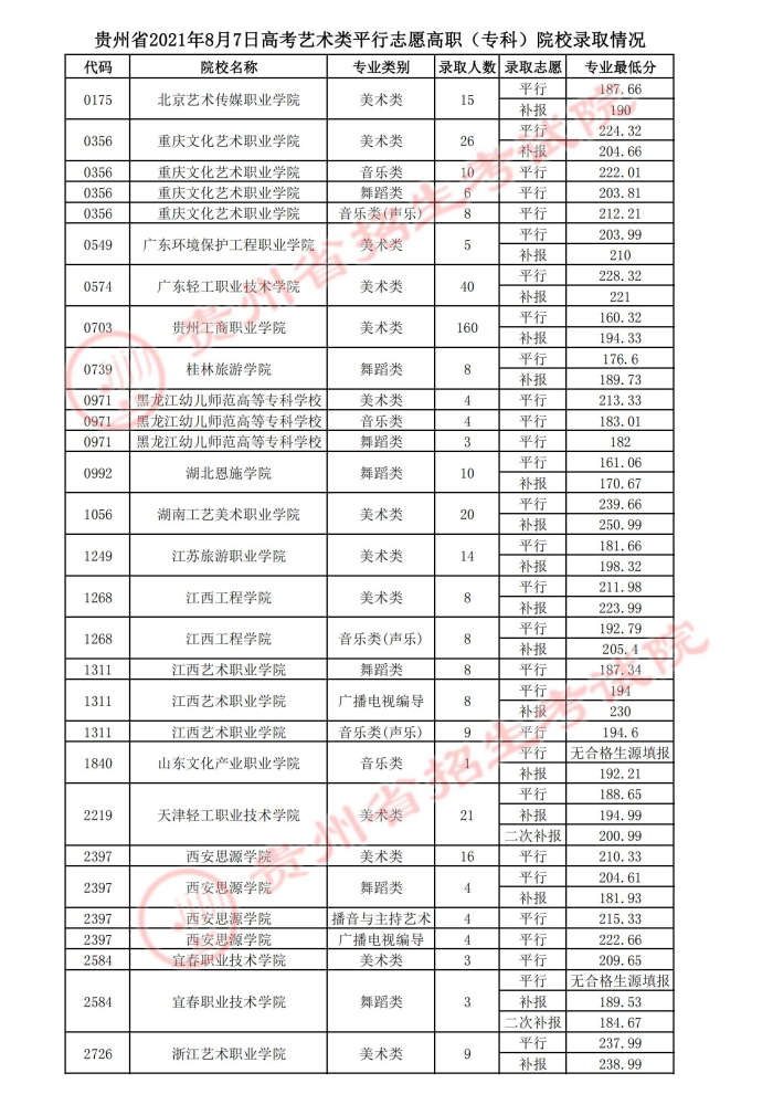 2021年8月7日贵州艺术类专科院校录取分数线情况