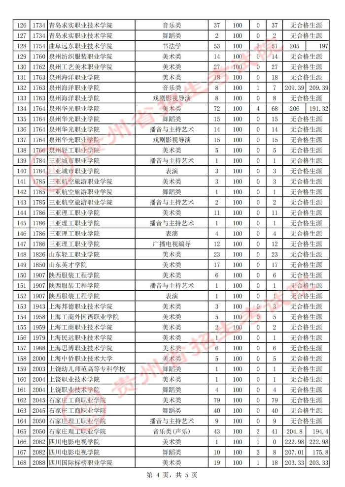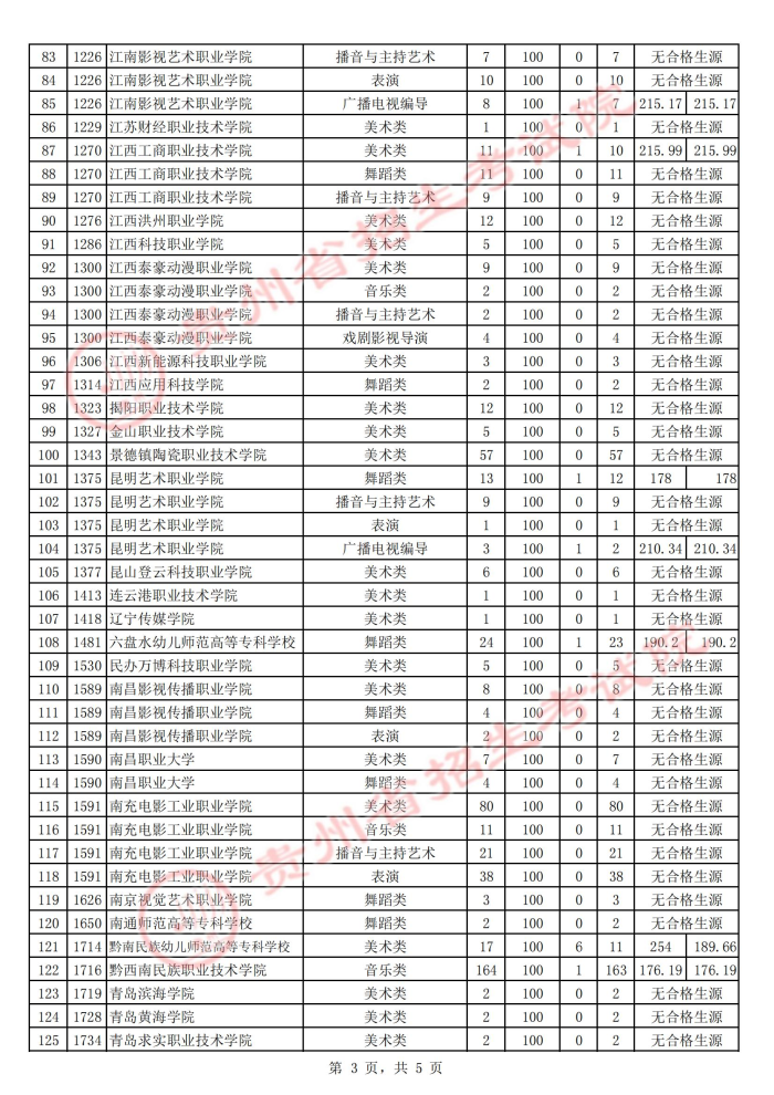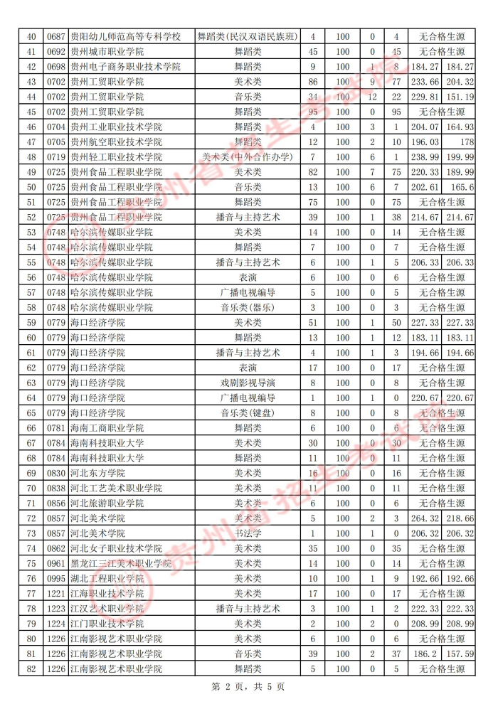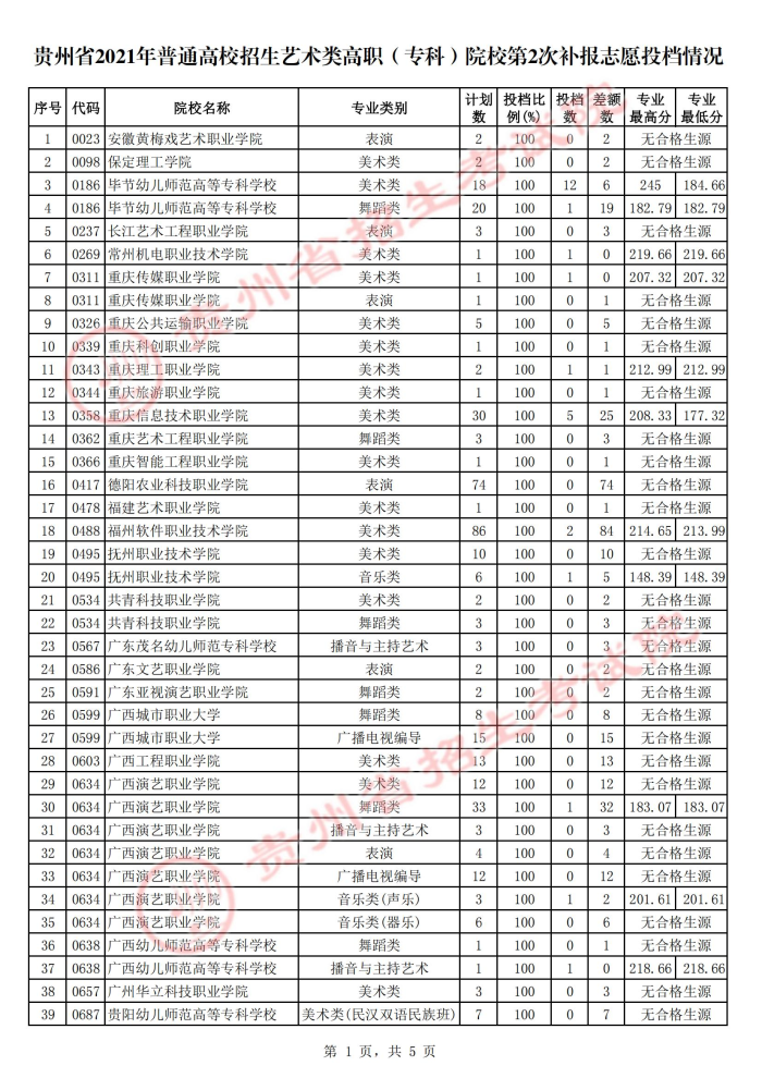 2021年8月7日贵州艺术类专科院校第二次补报志愿投档分数线