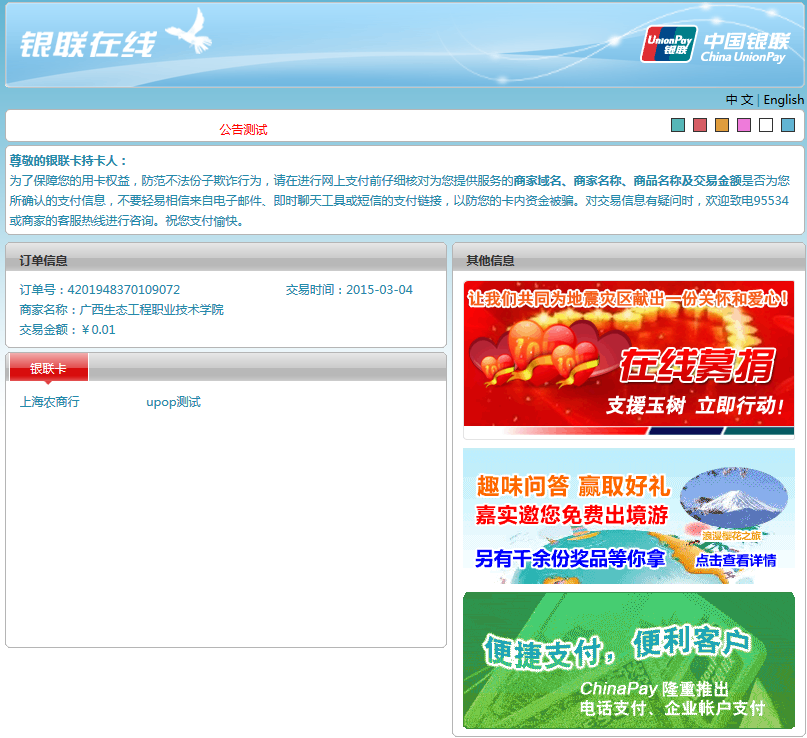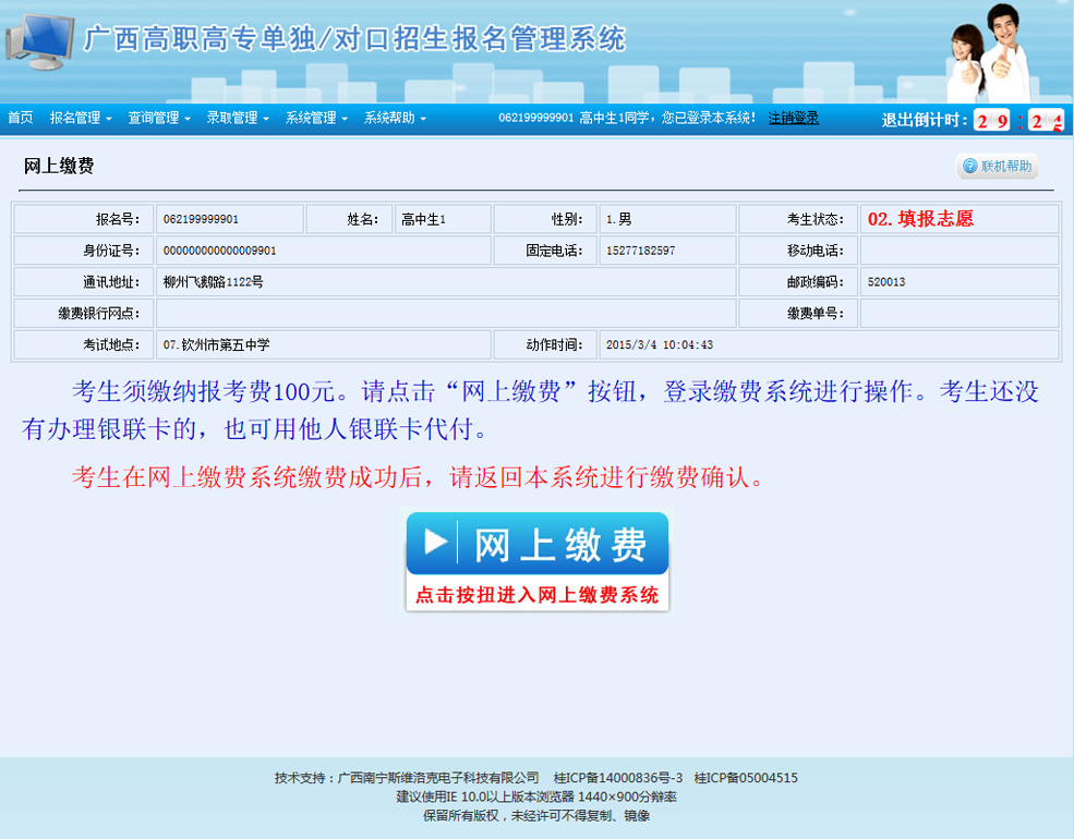 1、请登录报名系统,选择“网上缴费”菜单,点击“网上缴费”按钮进入缴费系统。