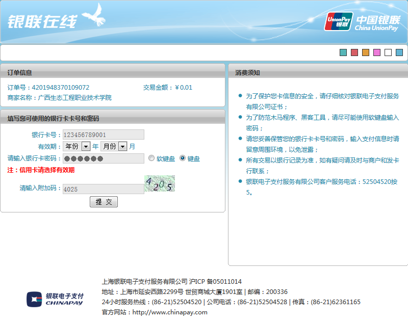 3、请输入银联卡卡号、密码、验证码。如果是信用卡需输入有效期。