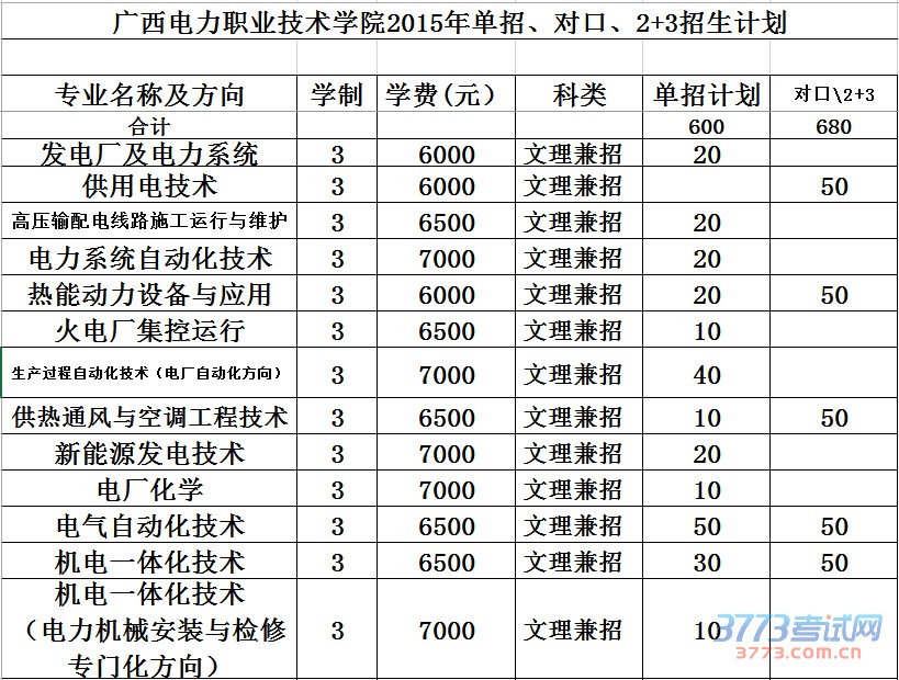 广西电力职业技术学院2015年单招、对口、2+3招生计划