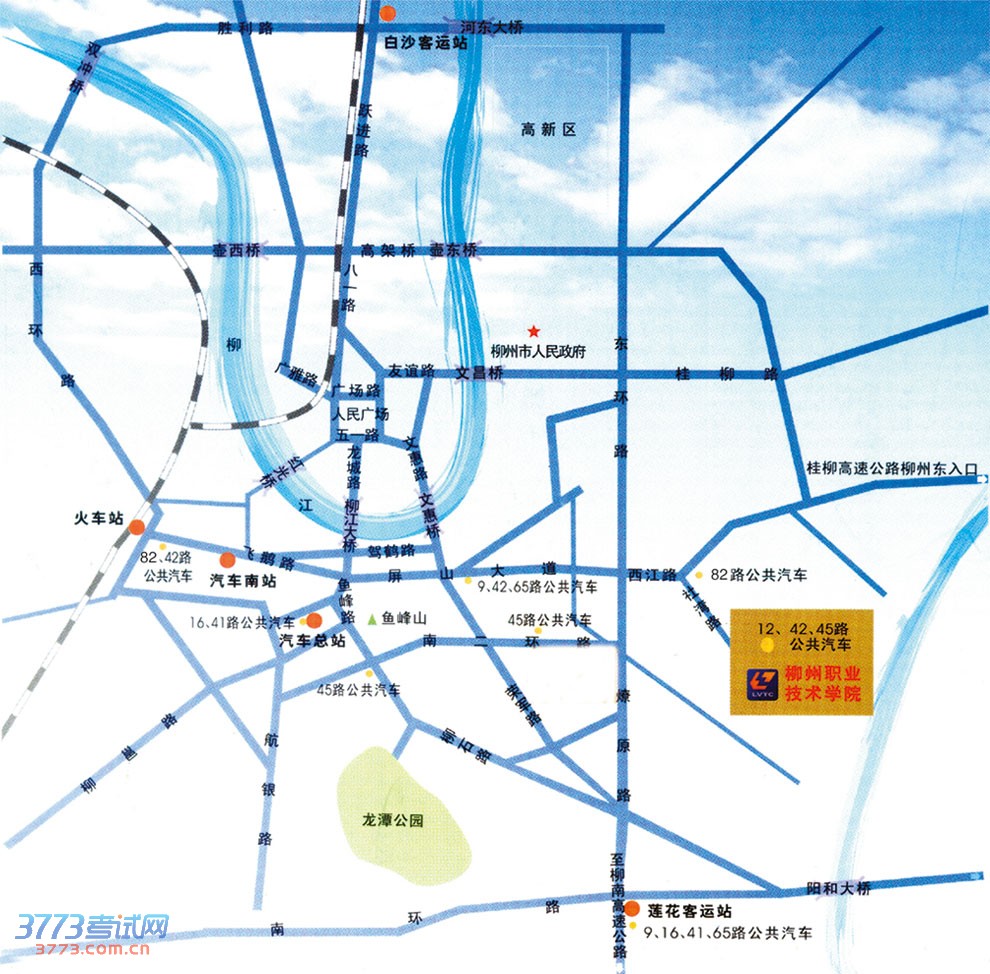 柳州市人民广场乘12路、火车站和汽车南站乘42路、汽车总站乘45路公共汽车到“社湾路北站”或“职业技术学院站”下车。