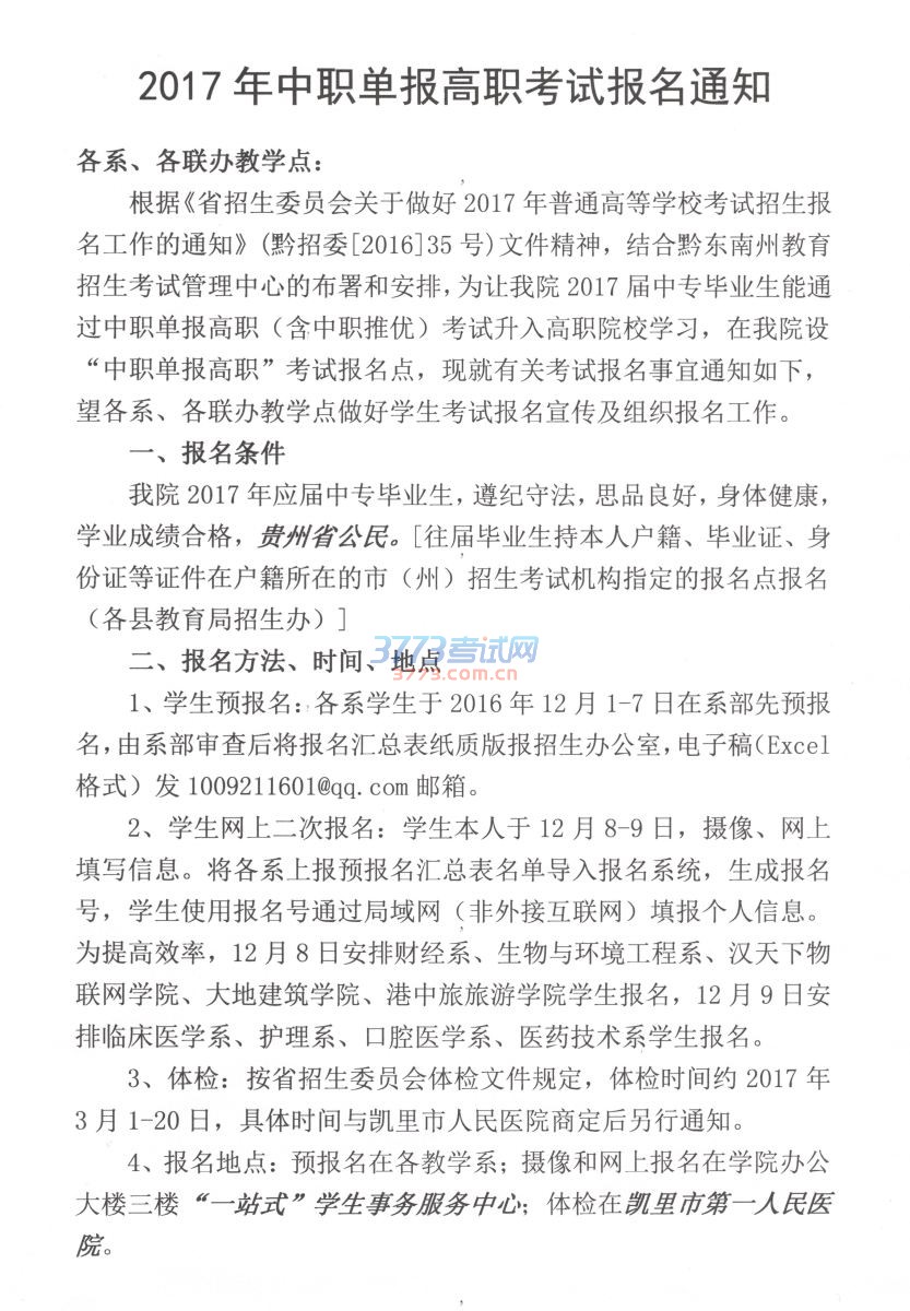 2017黔东南民族职业技术学院中职单报高职考试报名通知