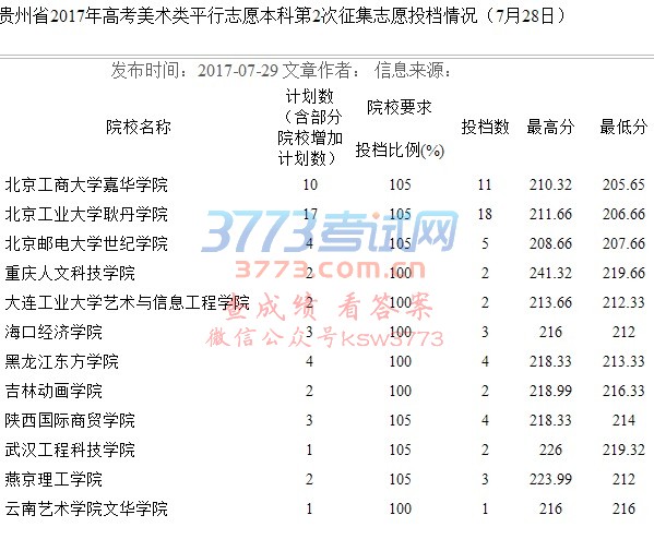 贵州省2017年高考美术类平行志愿本科第2次征集志愿投档情况(7月28日)