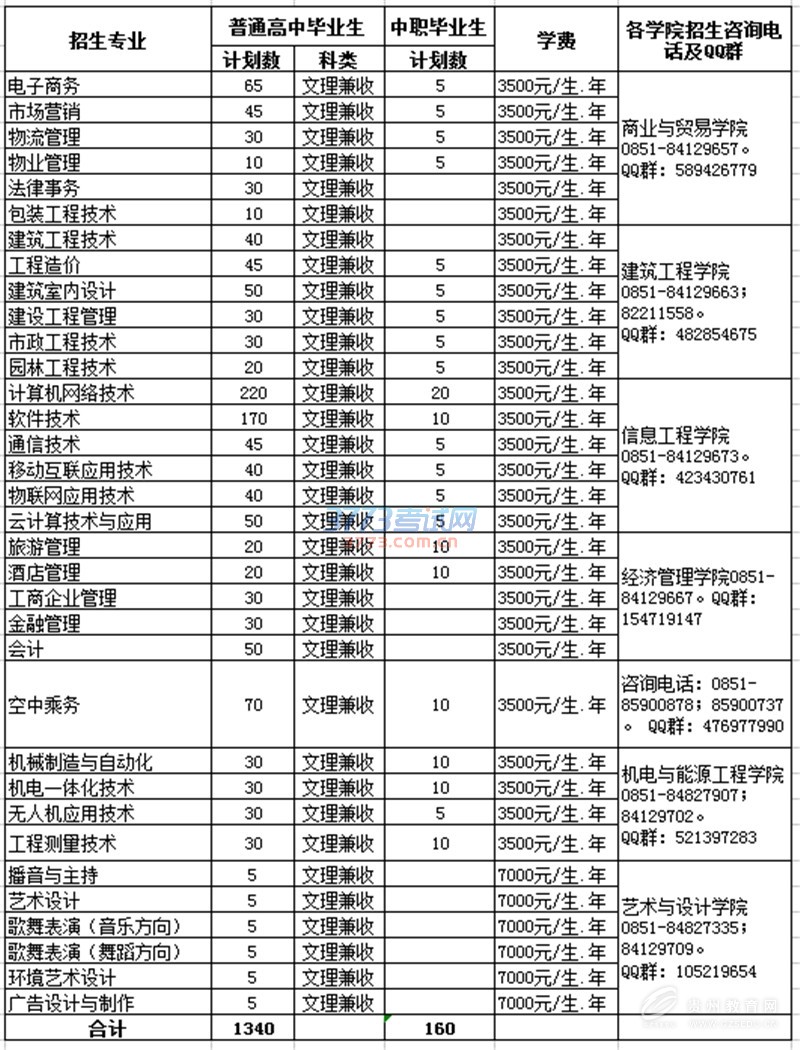 招收高中、中职应往届考生    学校自行考核,方式灵活    无需参加高考,提前录取    专业选择多样,推荐就业    学历待遇与统招考生相同    贵州职业技术学院是经贵州省人民政府批准,教育部备案成立的综合性全日制普通高等学校,隶属于贵州省教育厅,是公办的专科层次高等职业院校。2012年被贵州省教育厅授予“省级示范性高职院校”称号。先后荣获“贵州省文明单位”、“贵州省绿色大学”、“贵州省平安文明校园”、“贵州省大学生思想政治教育优秀学校”等称号,是培养生产、建设、经营、管理、服务一线高素质技术人才的摇篮。    学校地处贵阳市观山湖区云潭南路3号,地理位置优越,交通便利。校园占地面积613亩,建筑面积20.5万平方米。学校环境优美、设施齐备、功能完善、装备先进,完全能够满足教学管理和科学研究的需要。学校拥有教职员工500人,其中博士8人,硕士196人,具有高级职称121人,“双师型”教师188人。建有满足各专业需要的校内实训室和校外实训基地,每年提供学生顶岗实习的岗位近3000个。    学校建有信息技术、现代商务、旅游管理与服务、民族艺术、建筑工程、机电工程等6个校级重点专业群,在此基础上打造计算机网络技术、电商物流、建筑工程技术等3个校级骨干专业,涵盖近34个专业和专业方向,较好对接了贵州经济社会发展的产业布局。学校大力实施人才培养质量提升工程,全面落实立德树人根本任务,坚持“产教融合、校企合作”的教学模式,探索形成了“优势互补、对等投入、人才共育、过程共管、责任共担、成果共享、互惠共赢”的多元化合作办学机制,牵头成立了贵州现代商务职业教育集团,走出了合作办学、合作育人的创新发展之路,为贵州实现工业化、城镇化、信息化战略和同步小康目标提供了强力的智力支撑和人才保障。    学校招生规模逐年攀升,现有高职(专科)在校生近万人,历届毕业生平均初次就业率达97%,学生“双证书率”达100%,专业对口率、起薪水平、用人单位满意率均高于全省平均水平,在全省乃至全国的各项技能大赛、校园文化活动月、体育比赛中我校学生屡获大奖。学校加强与省内本科院校的联系和交流,一如既往重视学生专升本深造工作,先后有400余学生被省内本科院校录取。学校积极开展开放办学与合作交流,先后与台湾万能科技大学、建国科技大学、东南大学和加拿大堪纳多学院等高校开展师生互派、夏令营游学项目,共派遣学生出国(境)留学生80名,呈现出“进口旺,出口畅”的可喜局面。    一、招生对象及报名条件    1.符合2017年全国普通高等学校统一招生考试报名条件并取得高考报名资格的应、往届普通高中毕业生。按照普通高中学生学业水平考试有关规定,“学生须完成11门课程考试,考试成绩8门课程达到C等及以上等第的考生,可领取高中毕业证书”。    2.符合2017年全国普通高等学校统一招生考试报名条件并取得中职单报高职报名资格的应、往届中职毕业生。    3.报考我校艺术类专业的考生,必须是参加全省艺术类统考成绩上线的考生,且可以使用省统考成绩作为相应艺术专业的职业技能测试成绩。    4.空中乘务专业:女生身高160cm以上,男生身高170cm以上,双眼矫正视力不低于4.7E,五官端正,形象气质佳,普通话标准,身体裸露部位无明显伤痕,无纹身,无明显“X”或“O”型腿。    二、招生专业、计划、学费及咨询电话    三、报名时间 3月8日9∶00--3月14日17∶00。四、报名方式