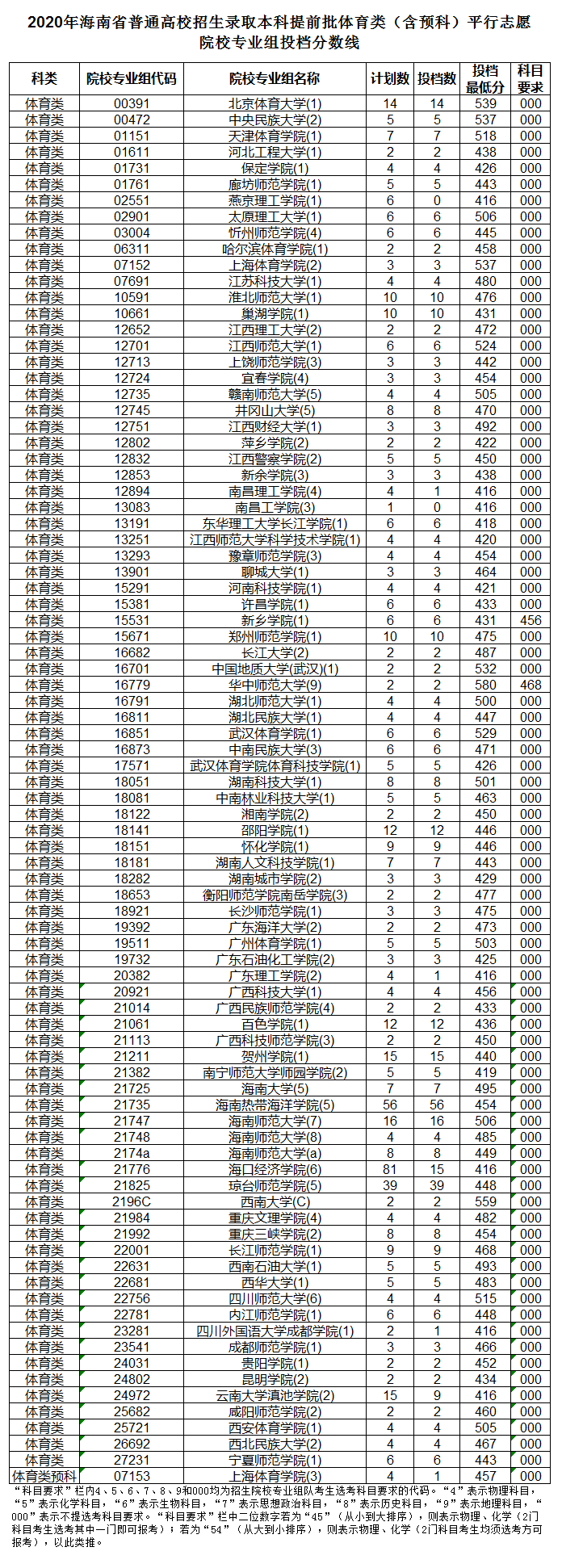 2020年海南省普通高校招生录取本科提前批体育类(含预科)平行志愿院校专业组投档分数线