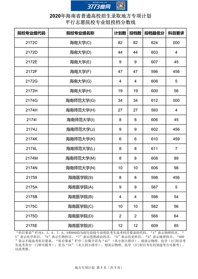 2020年海南省普通高校招生录取地方专项计划平行志愿院校专业组投档分数线