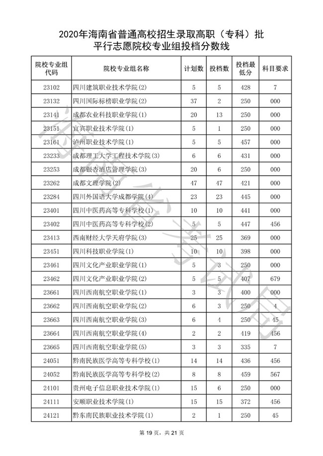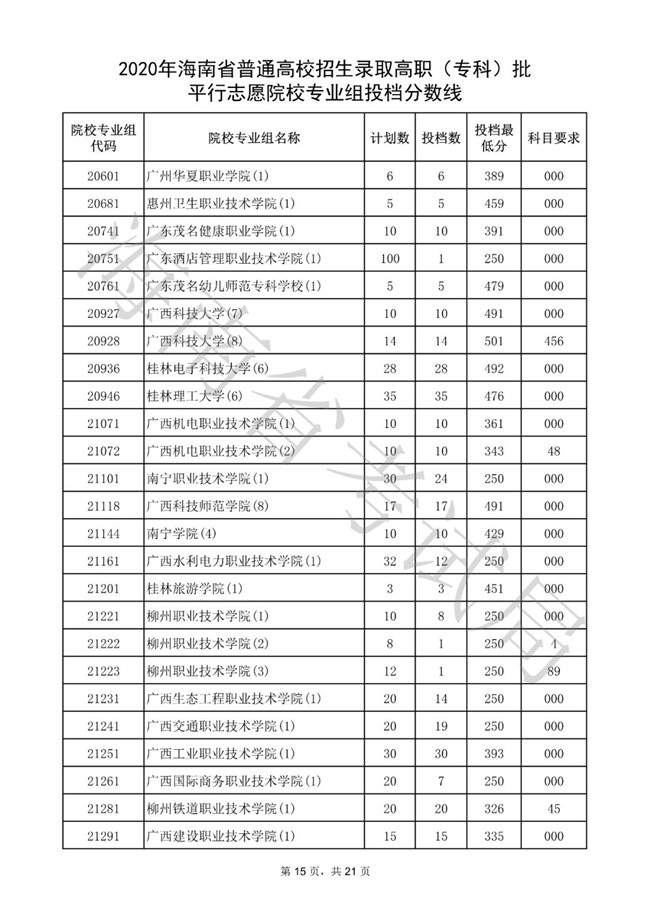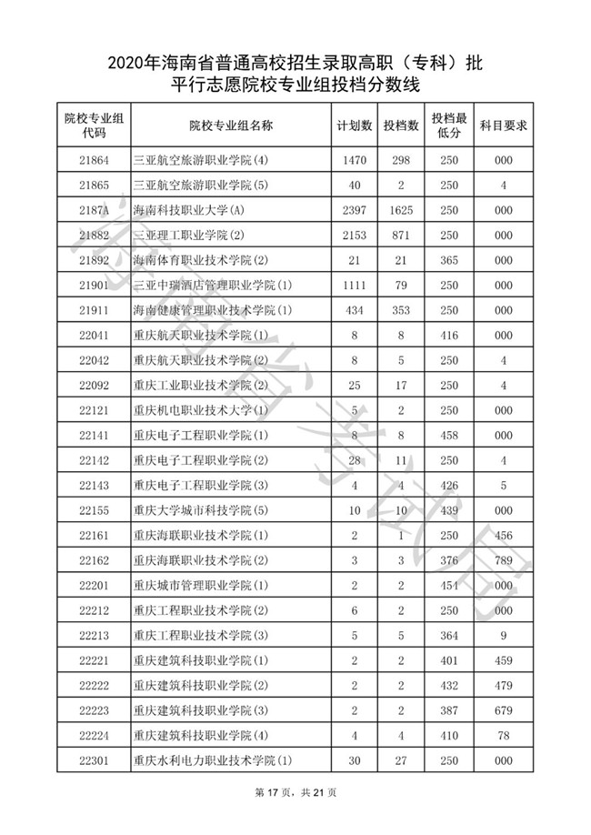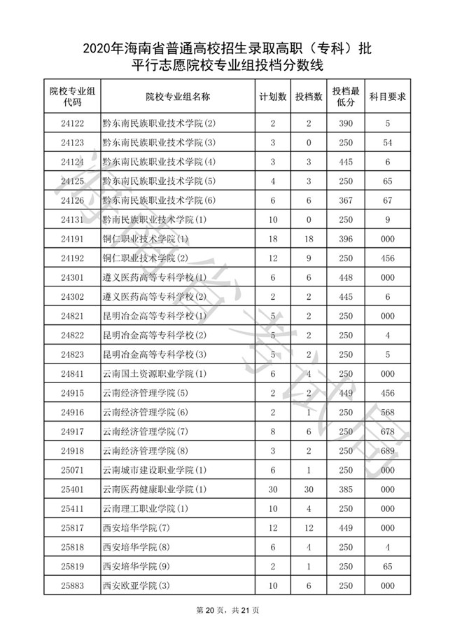 2020年海南省普通高校招生录取高职(专科)批平行志愿院校专业组投档分数线