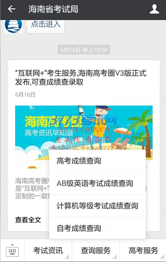2017海南高考成绩查询 考生可关注海南省考试局微信服务公众号,点“查询服务”->“高考成绩查询”菜单查询-海南考试局(http://ea.hainan.gov.cn/), 2017海南高考成绩查询时间方式,3773高考网也将在第一时间发布,请海南高考考生关注3773高考网并添加3773考网微信公众号。