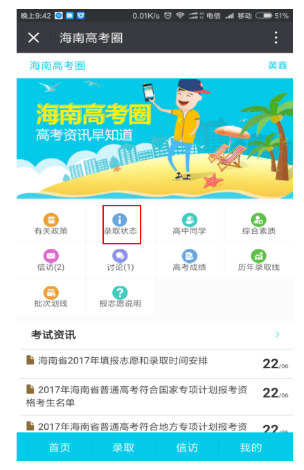 考生通过手机登录海南高考圈(gkq.hnks.gov.cn),点录取状态模块查询。该模块与高校录取系统第一时间同步, “自由可投、已经投档、院校在阅、录取” ,考生可以查看录取过程状态变化。
