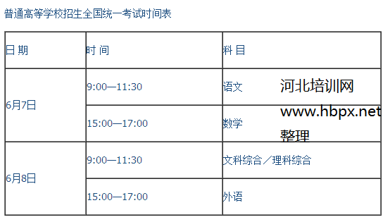 16.普通高等学校招生全国统一考试和对口招生河北省统一考试于6月7日开始举行,全国统考时间表由教育部发布,对口考试时间表由省招生委员会发布。考试时间表如下: