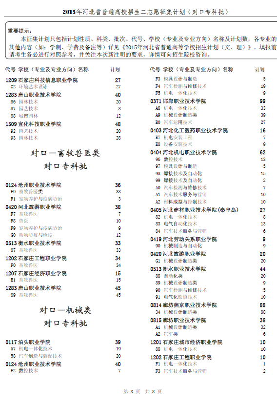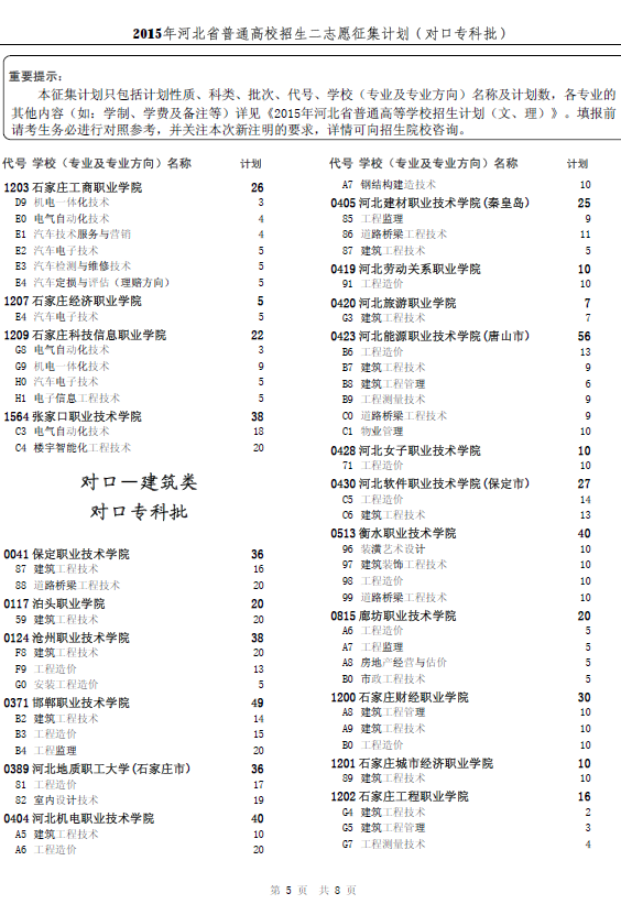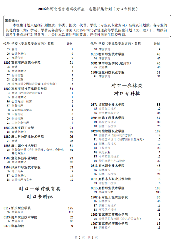 2015年河北省普通高校招生二志愿征集计划(对口专科批)重要提示:本征集计划只包括计划性质、科类、批次、代号、学校(专业及专业方向)名称及计划数,各专业的其他内容(如:学制、学费及备注等)详见《2015年河北省普通高等学校招生计划(文、理)》。填报前请考生务必进行对照参考,并关注本次新注明的要求,详情可向招生院校咨询。代号学校(专业及专业方向)名称计划对口对口—财经类对口专科批0117 泊头职业学院 1555 会计 150124 沧州职业技术学院 44E2 国际经济与贸易 8E3 会计与审计 9E4 会计电算化 17E5 市场营销 100371 邯郸职业技术学院 8A4 会计电算化 80389 河北地质职工大学(石家庄市) 6074 市场营销 975 会计电算化 476 会计与审计 777 资产评估与管理 1078 财务管理 1079 电子商务 1080 物流管理 100394 河北工程技术学院 4D0 会计 1D1 财务管理 1D2 电子商务 1D3 工商企业管理 10404 河北机电职业技术学院 4194 会计电算化 410405 河北建材职业技术学院(秦皇岛) 179 电子商务 10420 河北旅游职业学院 71E4 电子商务 14E5 物流管理 15E6 营销与策划 15E7 财务会计类 9E8 财务管理 9E9 金融管理与实务 90428 河北女子职业技术学院 7代号学校(专业及专业方向)名称计划68 财务会计类 70430 河北软件职业技术学院(保定市) 18C0 会计电算化 10C2 财务管理 80513 衡水职业技术学院 4981 会计电算化 1982 市场营销类 2083 税务(税务会计方向) 100681 冀中职业学院(定州市) 4944 会计电算化 490814 廊坊燕京职业技术学院 9430 财务会计类 4631 财政金融类 1332 物流管理 2033 营销与策划 150815 廊坊职业技术学院 3395 会计电算化 1396 财务管理 897 财政金融类 1098 市场营销 21200 石家庄财经职业学院 201A3 会计电算化 10A4 会计 70A5 会计与审计 65A6 物流管理 28A7 工商企业管理 281201 石家庄城市经济职业学院 2387 会计 231202 石家庄工程职业学院 17D9 会计 1E0 会计电算化 3E1 会计与审计 3E2 经济管理 2E3 国际金融 3E4 金融与证券 3E5 电子商务 21203 石家庄工商职业学院 53C0 工商企业管理 10C1 连锁经营管理 4C2 物流管理 5C3 城市轨道交通运营管理 5C4 电子商务 10