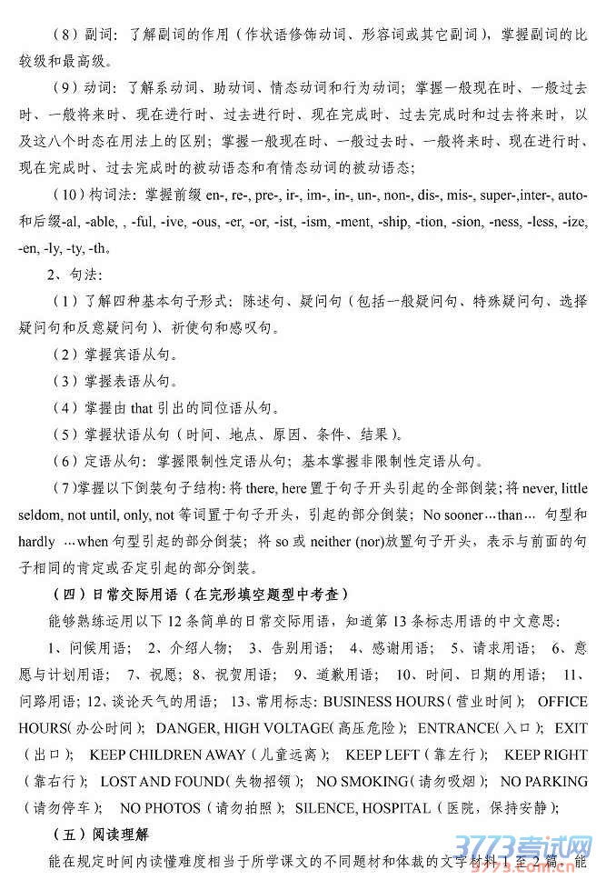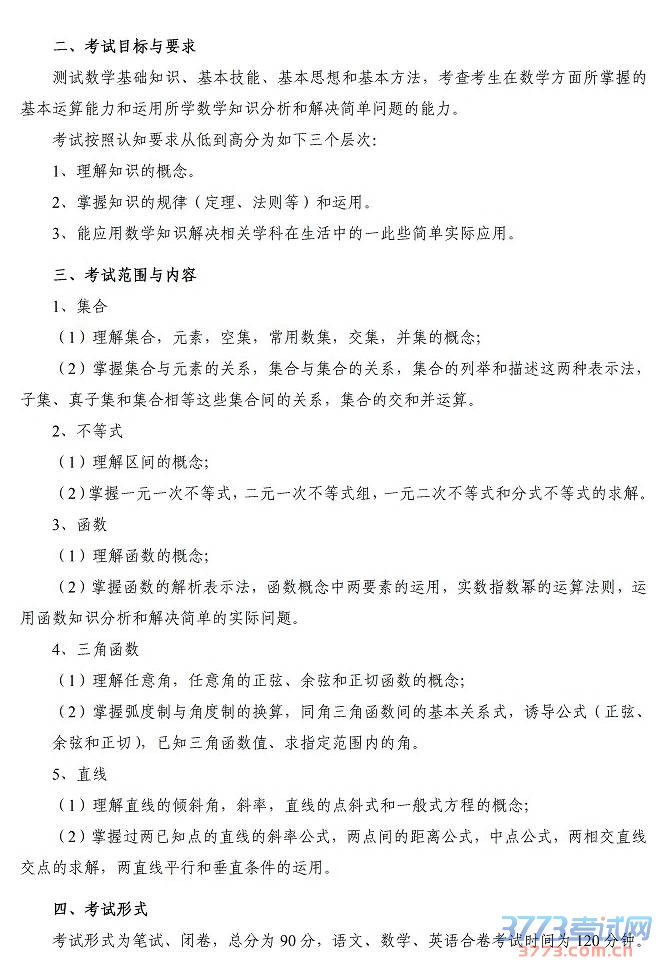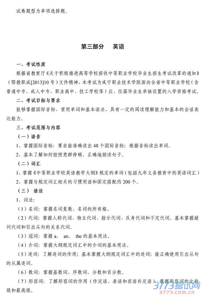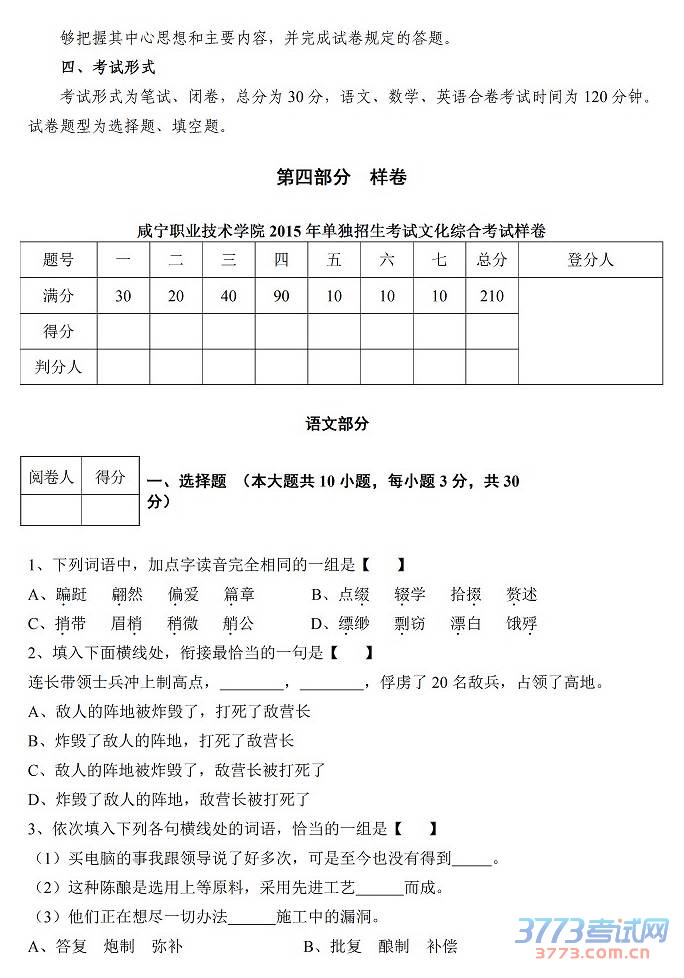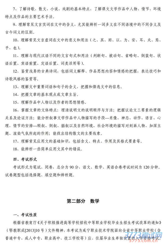咸宁职业技术学院2015年单独招生文化综合考试大纲及样卷