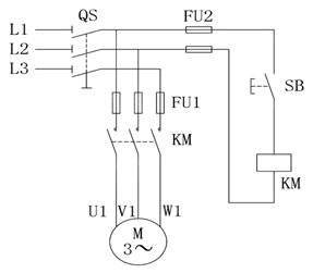 (说明:电路图中符号QS:闸刀开关,FU1保险、FU2保险,SB:按钮,KM:接触器,M:电动机)