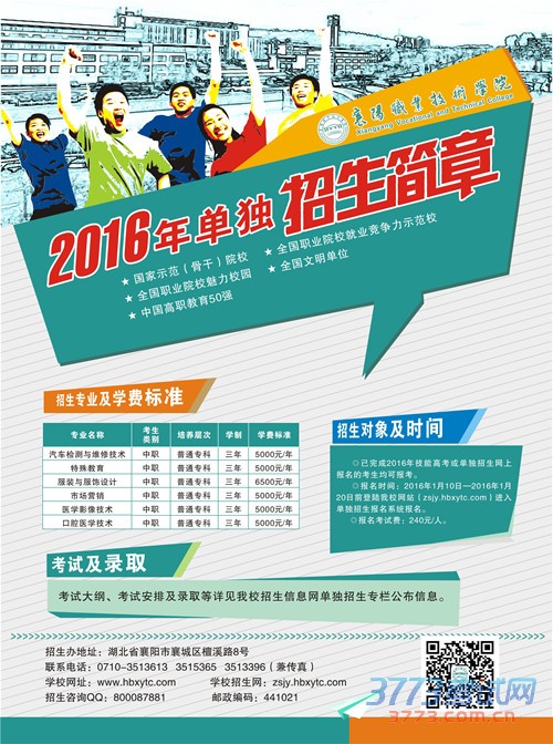 襄阳职业技术学院2016年单独招生简章