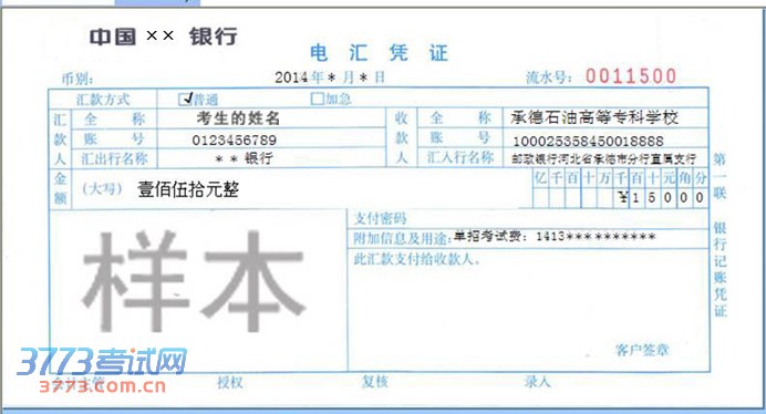 2、通过当地各商业银行营业网点以电汇方式(最好用随时到帐的电汇支付方式)汇款到我校指定邮政银行账户,务必在“附加信息及用途”栏中注明“单招考试费:考生号(14位的)”信息,收款单位、开户行、帐号等信息如下: