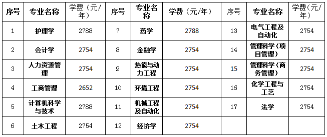 普通类专业学费每生每年5000元,艺术设计类专业学生学费每生每年6000元,按学年收取。住宿费每生每年800元,按学年收取。