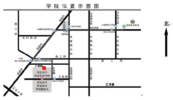 (4)乘车路线:1、石家庄新火车站(南站)乘319路、14路到石刻园下车西行至新石南路与石铜路交叉口换乘93路到河北女子职业技术学院站。