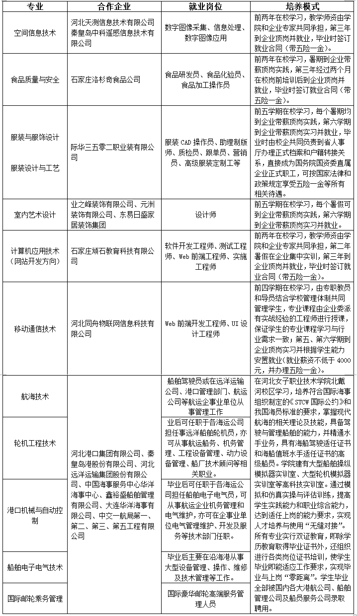 学院以“校企合作”、“订单式培养”、“顶岗实习”等手段为推进学生就业,根据企业生产实际、技术发展趋势,调整专业设置、培养目标和教学模式,依托地方经济发展开辟了校企合作人才培养模式,毕业生就业率居省内同类院校前列。其中,服装与服饰设计、服装设计与工艺、室内艺术设计、计算机应用技术、移动通信技术、食品质量与安全、摄影测量与遥感技术(空间信息技术方向)、航海技术、轮机工程技术、船舶电子电气技术、港口机械与自动控制、国际邮轮乘务管理等12个专业实行“订单式人才培养”,学生入学即可确定就业单位,就业率100%;护理、财务会计类、学前教等22个专业实行“校企合作”,分别与中国人民解放军际华白求恩和平医院、河北医科大学第二附属医院、省教育厅、省教育考试院、省政府机关事务管理局、新天际幼教集团、北京陶乐思幼教集团等近百家大型企业、事业单位签署协议,就业率均在90%以上。