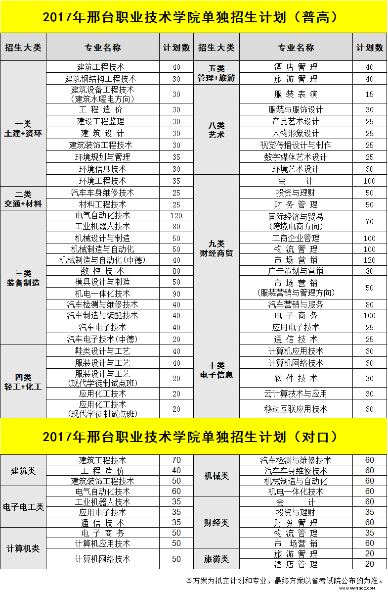 注:单招具体信息详见《邢台职业技术学院2017单独招生实施方案》