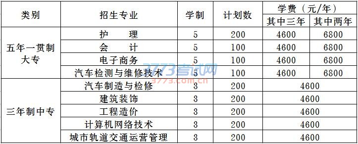 注:1、面向全省招收初中起点应往届毕业生,学制设有五年一贯制大专和三年制中专。 2、五年一贯制专业招收参加当年中考、达到省定录取分数线的应届初中毕业生。3、国家补贴政策:按照国家相关规定享受补助、助学金及贫困补贴;还可享受我院奖、助学金。