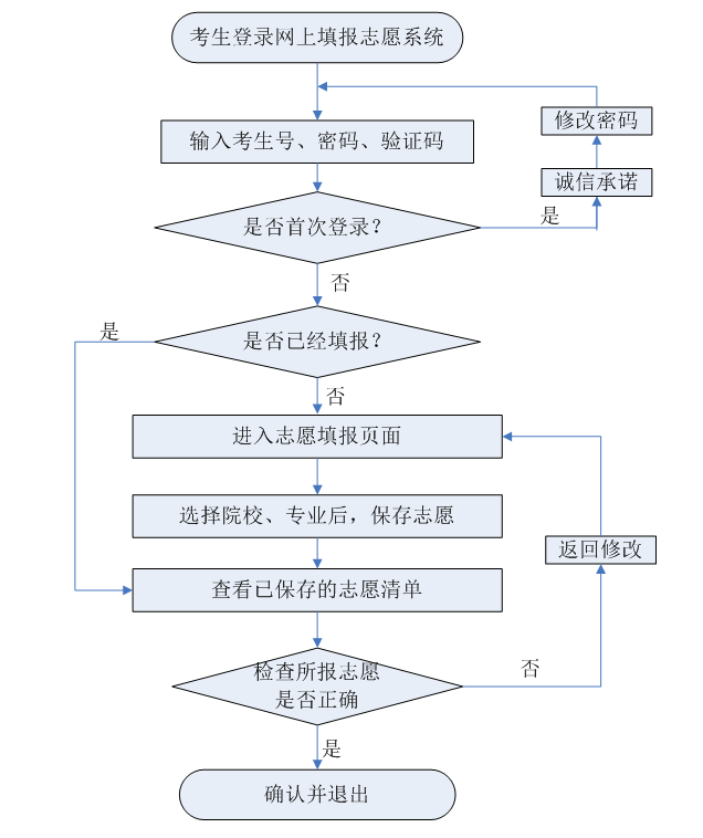 考生首次登录系统,须使用本人报名时所填报身份证号后8位作为密码进行登录,登录后必须先修改密码。请考生高度重视登录密码的设置和保管,密码设置不要过于简单,更不要将密码告诉他人,以防被他人篡改志愿,影响录取。