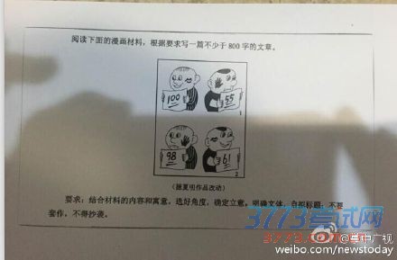 2016年全国高考正在进行,掌中广视记者在考试院发回最新消息,广东高考作文题目抢先曝光,问卷上市一幅漫画,漫画小人拿着类似考卷在展示,脸上印着唇印、巴掌印。要求考生看图写一篇不少于800字的我文章,需结合内容、寓意,自拟标题。