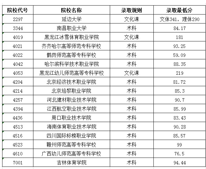 2020年普通高校体育类高职专科批院校录取最低分数线(一)