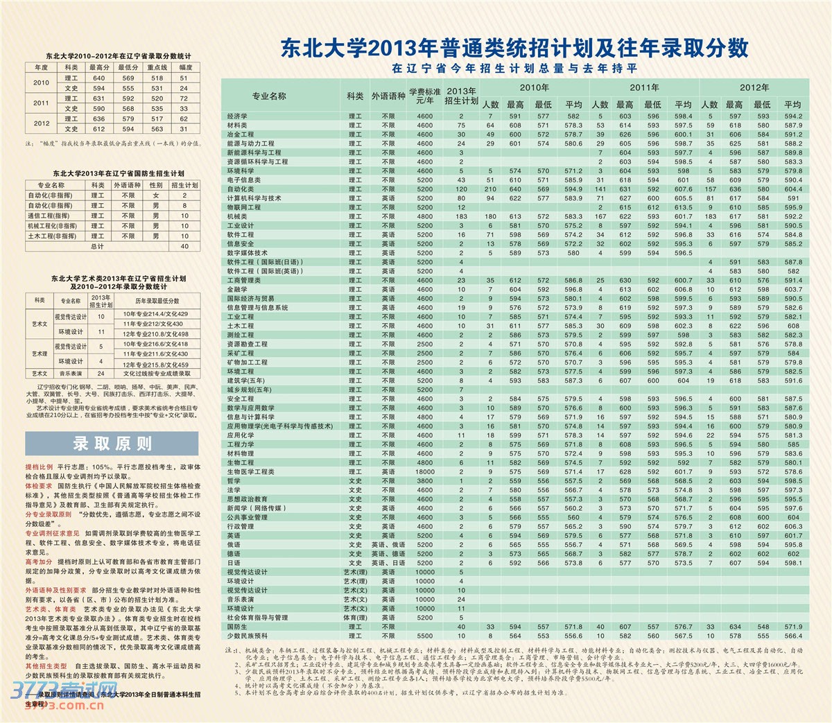 东北大学历年高招各专业在辽宁录取分数线