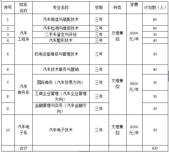 2015湖南吉利汽车职业技术学院单独招生专业及计划