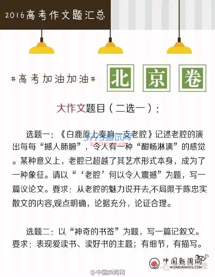 今年北京高考语文大作文为二选一,一是根据阅读材料“老腔”作文,二是“神奇的书签”,分值50分。