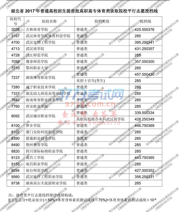 湖北省2017年普通高校招生提前批高职高专体育类录取院校平行志愿投档线