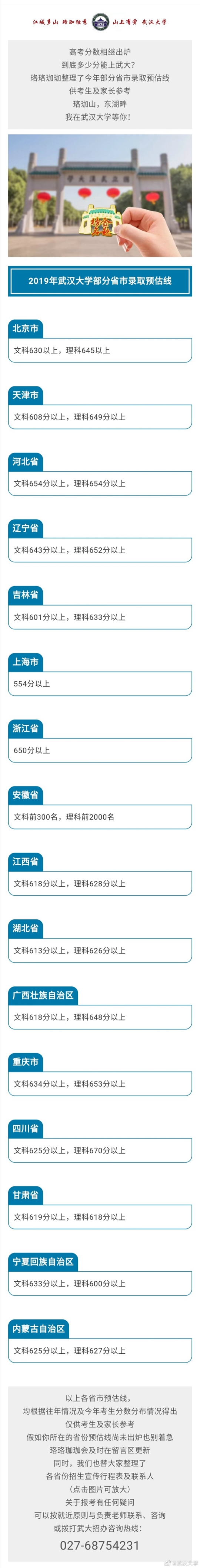 据武汉大学官方微博最新消息,2019年武汉大学各地录取预估线出炉,参见下图: