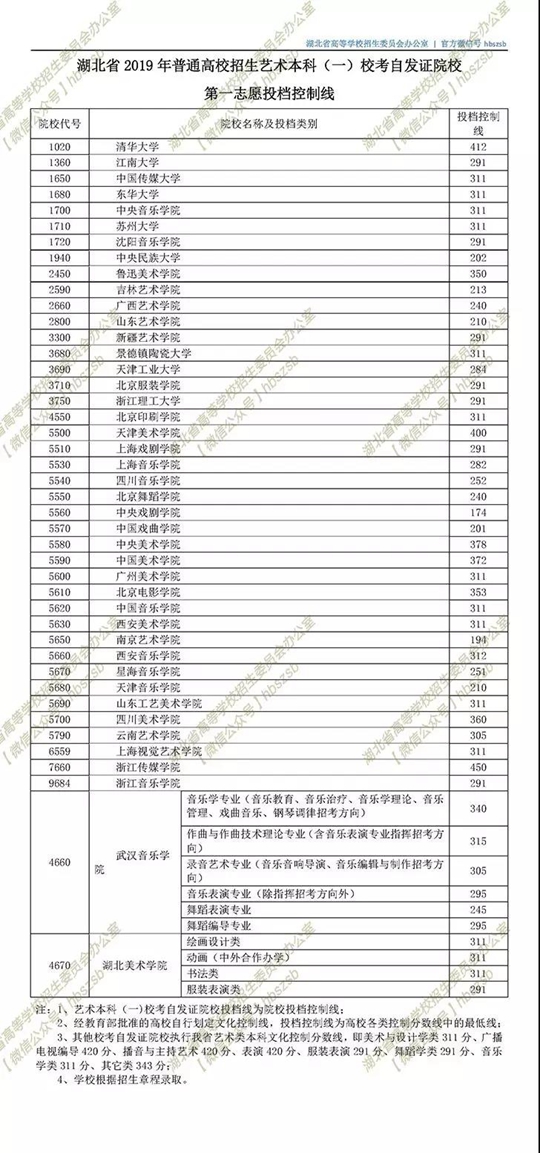湖北省2019年普通高校招生艺术本科(一)录取院校校考自发证一志愿投档线