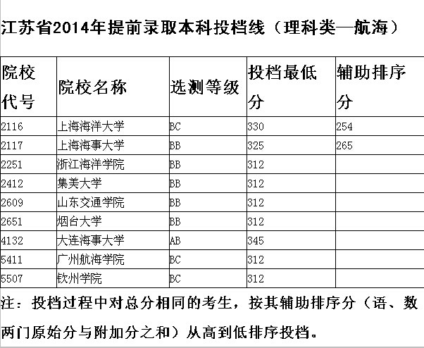 | 江苏省2014年提前录取本科投档线(理科类—军事国防) |