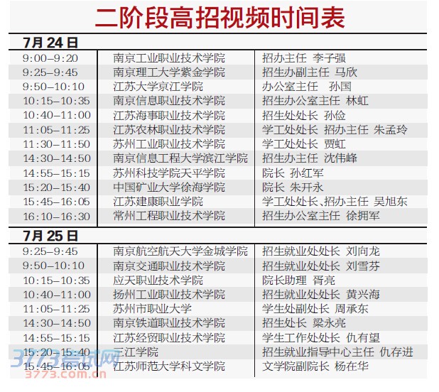 扬子晚报讯(记者 张琳) 江苏高招二阶段填报志愿7月26日正式开始,24日、25日两天,扬子晚报将约请江苏21所本三及高职院校的负责人做客扬子晚报网( ),预估分数线,解读今年招生政策,介绍重点专业,并回答考生有针对性的提问。考生登录扬子晚报网后,首页上即可点击“高招视频”专题,并留下问题。