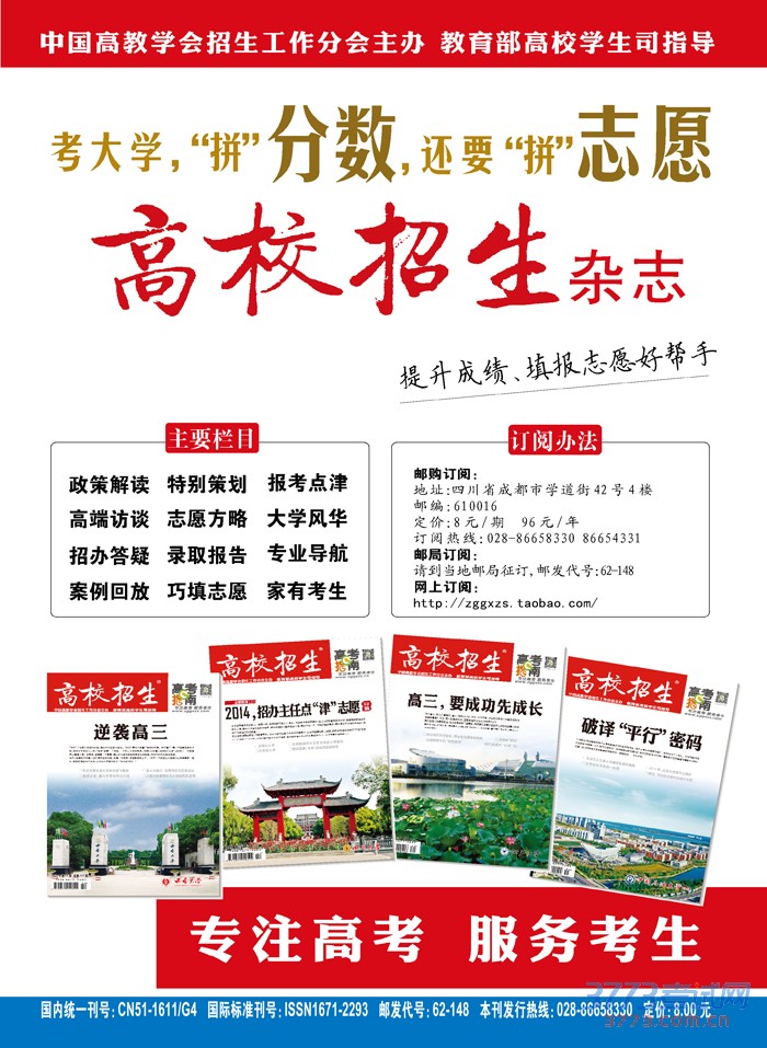 《高校招生》杂志既是全国考试招生政策信息传递的窗口和各省(区、市)考试招生制度改革宣传的阵地,也是考生了解招生政策和信息、报考大学、填报志愿、选择学校和专业的重要参考资料。