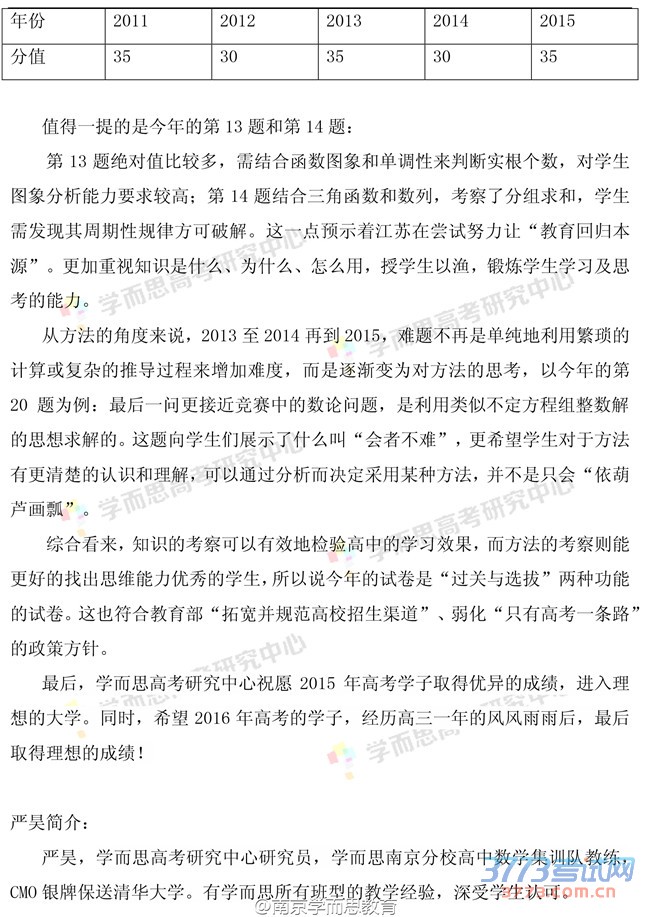 名师解析2015江苏高考数学试题:难度与
