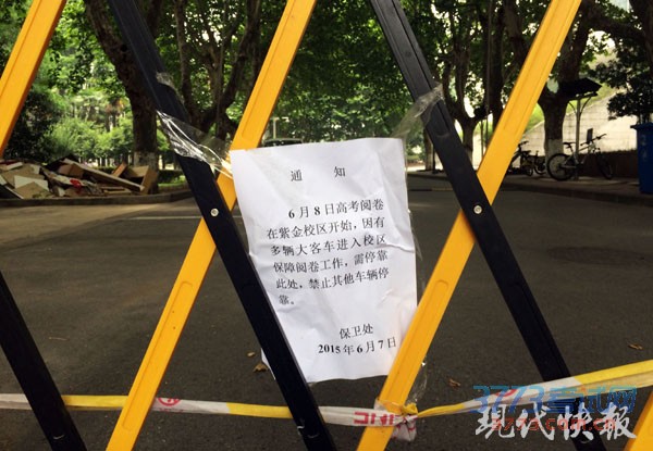 走进南师大紫金校区,高考阅卷的氛围已经在校园里弥漫。在综合楼楼下的小路上,已经搭起小型围挡,上面挂着保卫处6月7日的通知:“6月8日高考阅卷在紫金校区开始,因有多辆大客车进入校区保障阅卷工作,需停靠此处,禁止其他车辆停靠。”现代快报记者 金凤/文 徐洋/摄