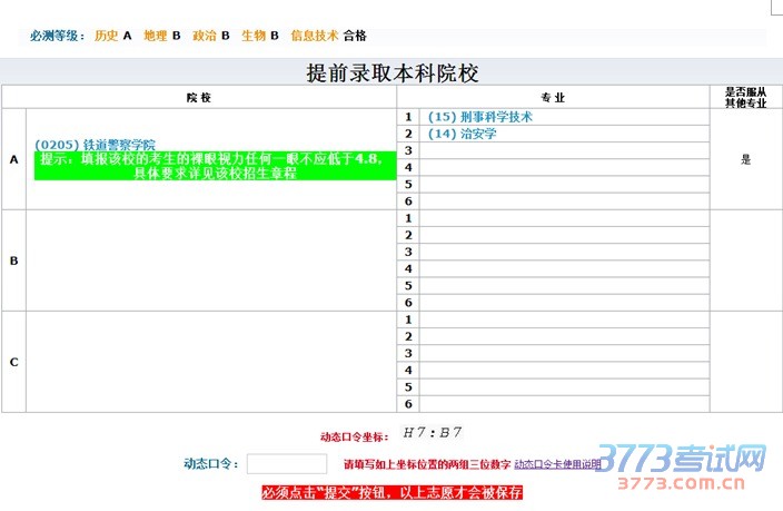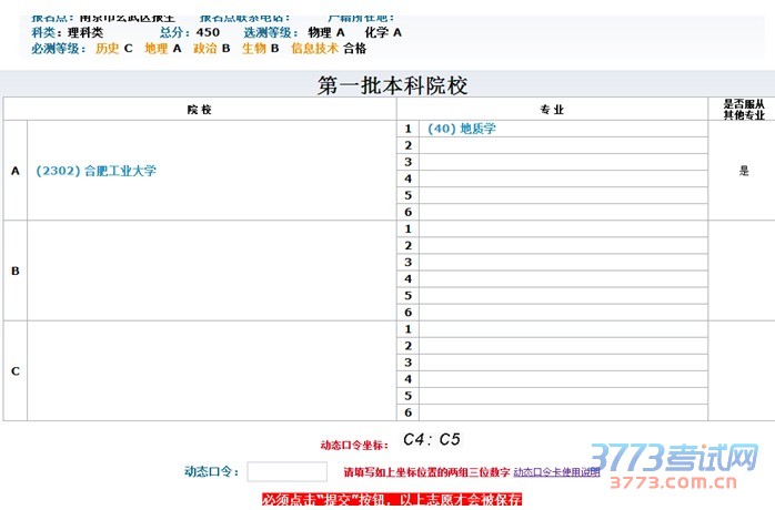 11、填报志愿时,在每次填报完成后提交志愿信息时,请根据页面上显示的位置,刮开本人动态口令卡背面密码区域对应位置。例如,页面提示请输入C4:C5位置的密码(如下图所示)