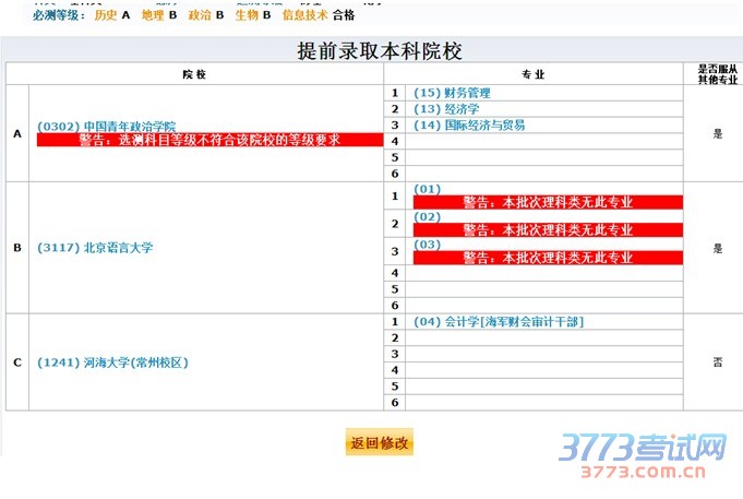 9、点击“确定”后,页面显示该考生所填的院校和专业名称,系统将自动对考生志愿信息进行逻辑校验,如有不符合相关规定的,系统会给出绿色提示或红色警告,绿色提示可忽略并强制提交,红色警告为严格控制,必须返回修改,直至没有红色警告信息出现。