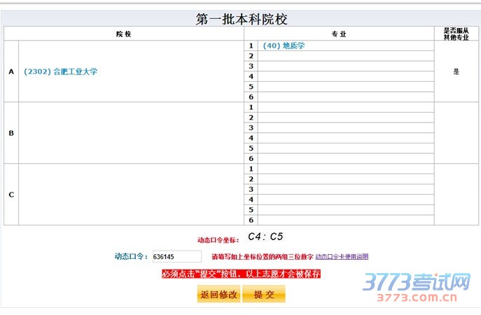 (3)然后根据页面上提示的位置,输入口令卡上相应的密码636145(如下图所示),即可完成志愿信息提交,每次修改、删除志愿时,也需要输入动态口令方能完成志愿的修改或删除。