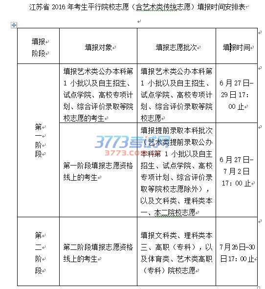 江苏省2016年考生平行院校志愿(含艺术类传统志愿)填报时间安排表