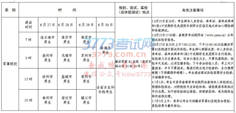 江苏省2017年军事、公安、司法院校面试、军检或体能测试安排